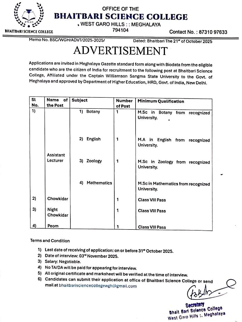 Bhaitbari Science College, located in West Garo Hills, Meghalaya, has released an official notification for the recruitment of Assistant Lecturers and Grade IV Staff. Interested and eligible candidates may apply in the prescribed form before 31st October 2025.