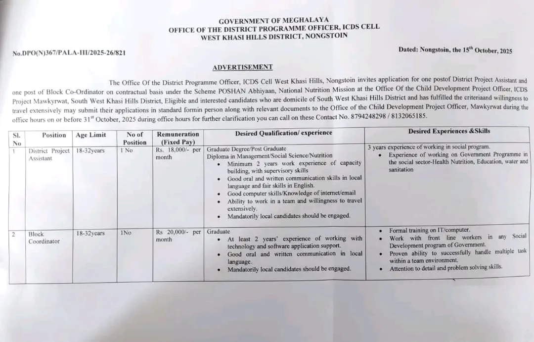 The Office of the District Programme Officer, ICDS Cell, West Khasi Hills District, Nongstoin has released an official notification inviting applications from eligible and interested candidates for contractual positions under the POSHAN Abhiyaan (National Nutrition Mission) at the Office of the Child Development Project Officer (CDPO), ICDS Project Mawkyrwat, South West Khasi Hills District.