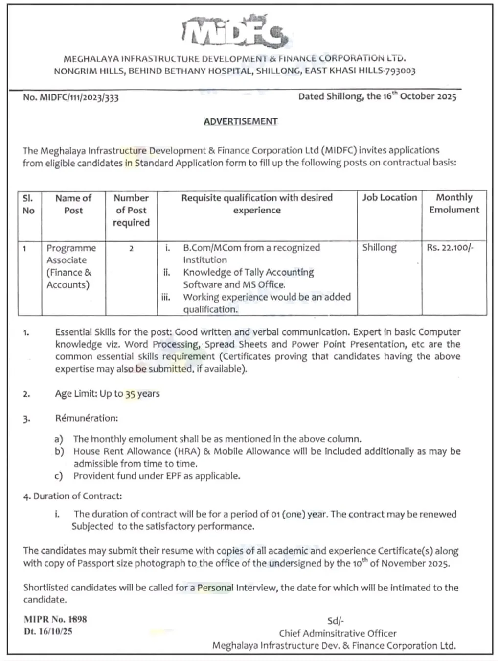 The Meghalaya Infrastructure Development & Finance Corporation Ltd (MIDFC), located at Nongrim Hills, Behind Bethany Hospital, Shillong, East Khasi Hills, has released an official notification inviting applications from eligible candidates for the post of Programme Associate (Finance & Accounts) on a contractual basis.
