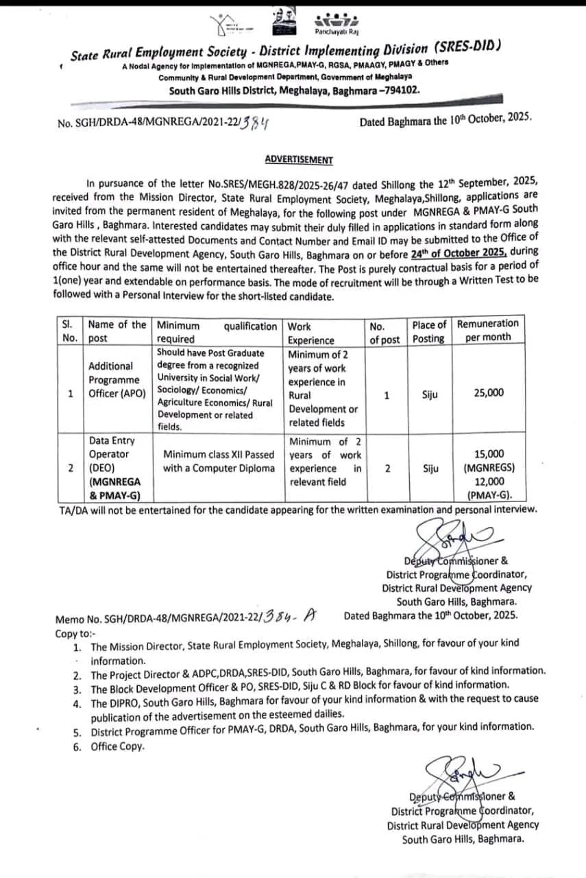 The State Rural Employment Society – District Implementing Division (SRES-DID), South Garo Hills District, Baghmara has released an official notification inviting applications from eligible permanent residents of Meghalaya for the recruitment of Additional Programme Officer (APO) and Data Entry Operator (DEO) posts under MGNREGA and PMAY-G schemes.